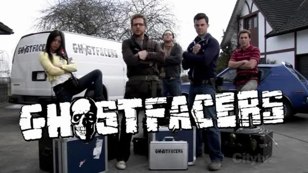 Un anuncio del programa Ghostfacers se ve en el centro de la