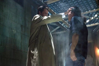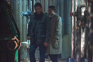 Back in Salina, Sam has found another person who went missing during a strange weather phenomenon: Luigi Ponzi in Rome. He's telling Dean about it when Castiel appears in their motel room. Shocked, the brothers ask him how he escaped Purgatory. Castiel says he doesn't know - he just appeared on the side of the road in Illinois and has been trying to reach them since. He's not at full power, though, and he goes to take a shower. Dean remembers the moment they found the way out of Purgatory and he performed the ritual to take Benny's soul into his arm. He and Castiel had been heading for the portal when Leviathans had appeared to attack them. While Castiel is in the bathroom, Dean tells Sam that he's not sure he believes Castiel's story because he remembers every moment of Purgatory, and considering the shape Castiel was in, someone or something must have pulled him out.