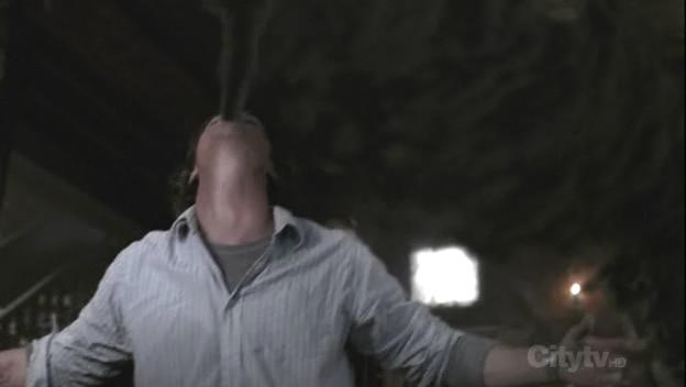 Dean barges into the room pointing his gun at Sam. Sam sounds and behaves like himself when he sees his brother and says he can't control his actions. He begs Dean to kill him, or he will kill Jo, but once again Dean is unable to pull the trigger on his brother and turns his back on him, asking him to stop and come with him. Sam is enraged, moves towards him and shouts, "Are you that scared of being alone that you'd rather let Jo die?" Dean turns around and throws holy water at Sam's face which burns and smokes, showing Sam is possessed by a black-eyed demon. With smoke pouring out of his face, the demon runs and jumps out of the window. Dean quickly unties Jo and then runs to follow Sam into the storage docks next door. Jo, still unsure of Sam's state, calls after Dean, "He was possessed?!". Belaying her question, Dean jumps out in pursuit.