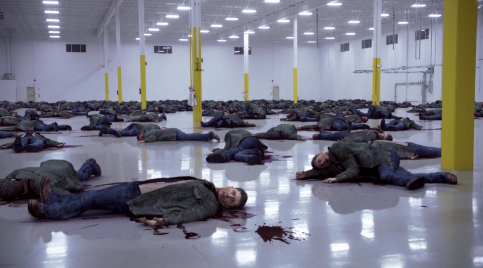 - The dead clones were seen lying in various positions throughout the warehouse in pools of blood.