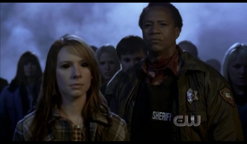 After Henriksen started playing a recorded exorcism over the station's PA system, the demon fled out one of the doors where he found Nancy Fitzgerald laying down a salt line to trap the demons inside. The demon appeared to consider killing Nancy, but as the exorcism continued, he fled instead, allowing Nancy and Deputy Phil Amici to finish laying down the salt lines and trap the demons inside the station.