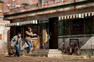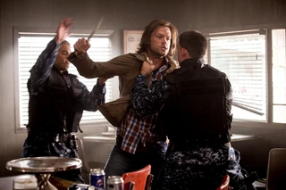 The four hunters set up in a local diner and check their weapons. The demon-sailors walk down the street, carrying assault rifles, and Dean calls to them. When the demon-sailors burst into the diner, they realize that Dean has left an iPod with a recording. Meanwhile, the hunters prepare to split up. Sam prepares to go with Tracy, but she shoves him back, saying that a demon celebrated by killing her parents because Sam let Lucifer out of his cage.[1] Dean takes Tracy and Sam goes with Irv as they split up to flank their opponents.