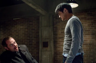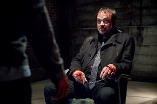 Kevin asks Crowley how to kill a Knight of Hell, and the demon offers to kill her if Kevin releases him. The prophet refuses to bargain, but Crowley figures that he's there for revenge for killing Kevin's mother. Crowley points out that Kevin never saw the body and she could still be alive, and Kevin punches him. When Crowley dares him to do better, Kevin glances over at a shelf of torture implements and the demon tells Kevin to let it all out.