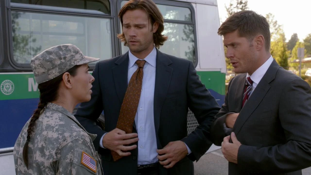 The Winchesters get word when the bus turns up empty and drive to the scene. They pose as FBI agents and try to get the MP on duty, Sgt. Miranda Bates, to let them through. When she refuses, they call Kevin and tell him to pretend to be their FBI superior. She soon realizes that he's bluffing, but Kevin checks her background on the Internet, finds her risqué photos from vacation, and tells her to do whatever Sam and Dean say. The sergeant quickly walks off and Kevin tells Dean that he hacked the military computers. The brothers board the bus and confirm that all of the bodies have fatal wounds and are at least ten years old. Sgt. Bates provides them with security footage showing the three sailors walking off along with Abaddon, and they recognize the Knight of Hell.