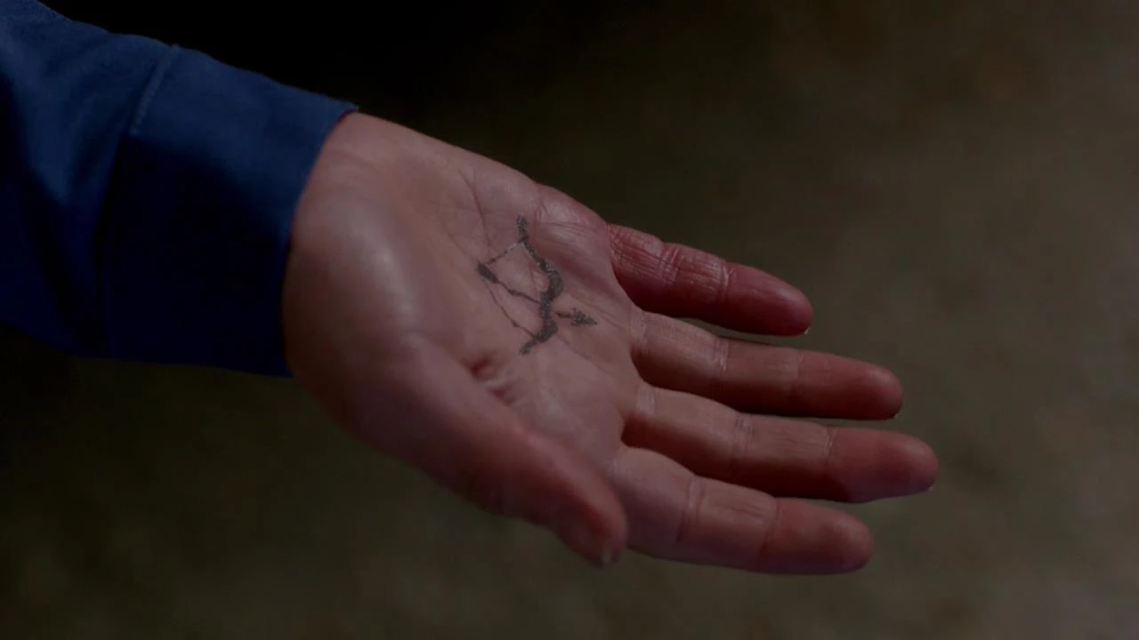 Outside the bar, Dean and Castiel faced her. Castiel wanted to take her bow by force, but Dean convinced him to talk with her first. The two explained to her that they needed her bow to fix things in Heaven and then she agreed to help them, saying how chaotic Heaven was. She extended her hand, where her bow appeared as a mark.