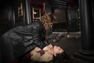 A woman enters Rowena's apartment and begins to ransack the place. After several minutes of this, she collapses and falls, dead, to the floor.