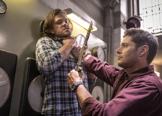 As Sam lays unconscious, he dreams of when Dean bore the Mark of Cain. In the Bunker, Dean hits Sam, causing him to fall from the catwalk. Dean teleports to Sam, and while Sam tries to talk him down, Dean grabs Sam by his neck, strangling him. Lifting Sam off the ground, Dean's eyes go black before he takes the First Blade and drives it into Sam, killing him.