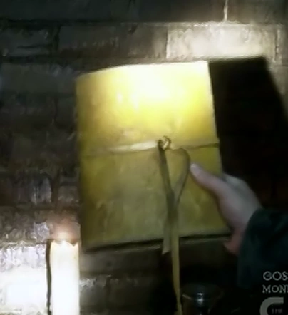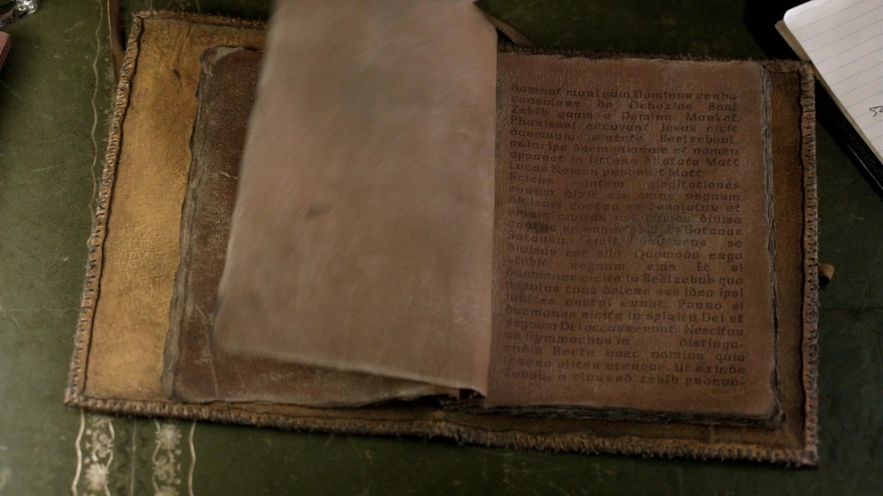 It is a book with a leathery yellow cover with a cord of similar material to keep it bound. According to Bobby, it originated around the fourteenth century. Its pages were made of human skin.