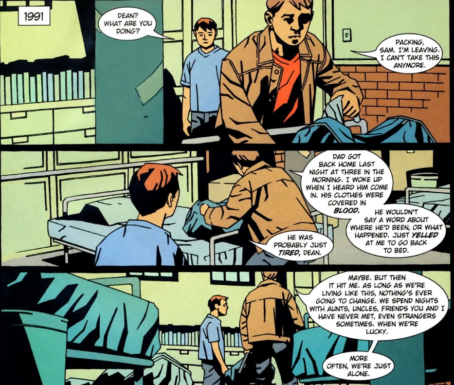 In 1991, Sam Winchester finds his brother, Dean Winchester, packing his bags and questions where he is going. Dean confesses that he is leaving as he cannot handle the situation and that during three in the morning, their father, John Winchester, came back to the motel room covered in blood and yelled at him to go back to bed though Sam rationally suggests he was just tired which Dean believes but then still plans to leave his brother and father believing that it would be for the best and promises Sam that he will find his younger brother again.