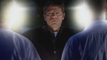 Later, Dean and Castiel visit Sam, who is still seeing Lucifer and has withdrawn entirely from reality. Castiel explains that Sam's mind is too far gone and he can't fix it. However, he realizes that he can shift the problem. He tells Dean that it's better that way, touches Sam's head, and draws red veins of energy into his own body. Sam snaps back to normal but now Castiel sees Lucifer and backs up in horror.