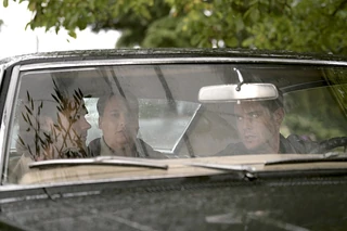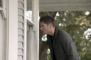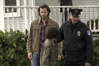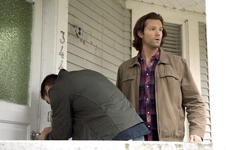Going inside the house Sam and Dean know that the wife is there because her car is in the driveway. Seeing furniture overturned through the window, the boys go into the house with their weapons out. They split up and scour the house; Dean goes down to the basement. While Sam is looking around the main floor. Dean finds the wife and boyfriend, dead with their throats slashed. Then he gets knocked out by the butt of a shotgun. Meanwhile, Sam finds the son tied up in a closet. While helping him out of his bindings, he places his weapon down. When the boy looks behind Sam, Sam turns around and the babysitter is there cocking a shotgun and aiming it at him. Sam raises his hands.