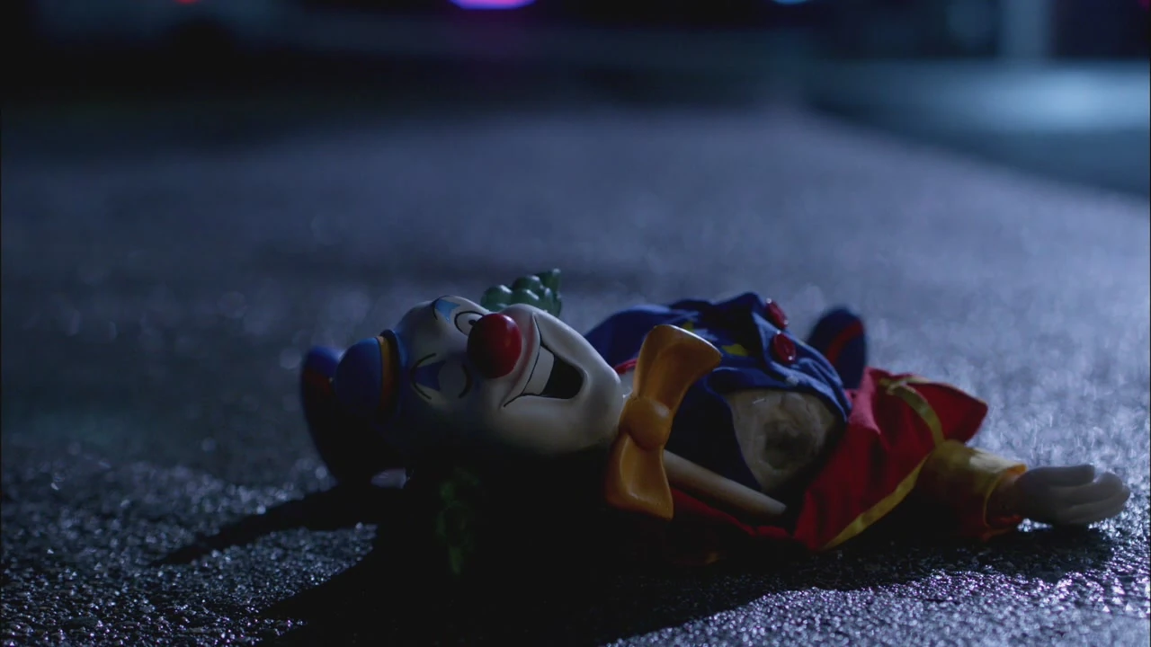 In Plucky Pennywhistle's Magical Menagerie, Sam gives Dean the giant slinky that he won. Dean has a Plucky doll for him and Sam leaves it behind as they drive off. The clown doll is lying on the road with the head broken away from the body. It winks and we hear the sound of a clown laughing quietly.