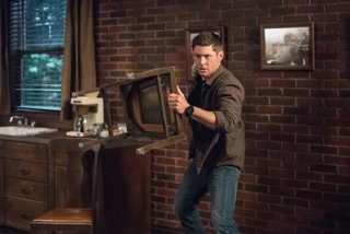 Dean speaks to someone on the phone while arguing with Sam. He tells Castiel to contact him when he reaches Amarillo, Texas, then hangs up and devotes his full attention to the argument. He is frustrated: they’ve been searching for Gabriel for two weeks while Mary and Jack are in danger. Now, Rowena has tracked Gabriel‘s “essence“ to two places: Texas, where Castiel has gone to check thing out, and wherever Sam and Dean are. The brothers’ argument is interrupted by an insistent knock at the door. They arm themselves and open the door—room 3—to find none other than Gabriel, who is clearly injured.