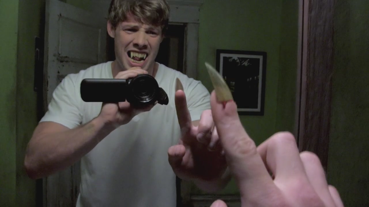 That night, Kate dozes off and Mike goes to the bathroom mirror and admires himself. However, as he films himself he realizes that he is growing fangs and claws. He smashes the mirror and then goes to look at the sleeping Kate for a minute. After stroking her cheek, he goes down to the kitchen and empties the refrigerator, but is still hungry. Scott and his friends are out patrolling the neighborhood, looking for the killer animal. Scott films himself and spots Mike, who says that he isn't in the mood for Scott's antics. Mike runs off into the woods and Scott chases after him, calling him a coward and saying that he'll go after Kate if Mike won't turn around and fight him. As Scott tries to spot him, Mike transforms and attacks him. The next morning, Brian wonders if Kate is scared of Michael but she says that his being a superhero is kind of hot. Mike comes in, covered in blood, and his friends stare at him in horror. He takes a shower to wash off the blood and then tells them that he killed Scott. They go over the footage that Mike filmed in the bathroom and see his claws, and Kate tells Brian to turn off the camera.